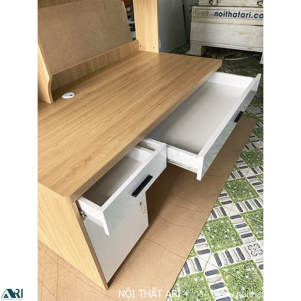 • Hệ thống ngăn kéo & Hộc tủ: Bàn trang bị 2 ngăn kéo tiện lợi và 1 hộc tủ cánh mở phía dưới, giúp lưu trữ vật dụng cá nhân một cách gọn gàng, kín đáo.