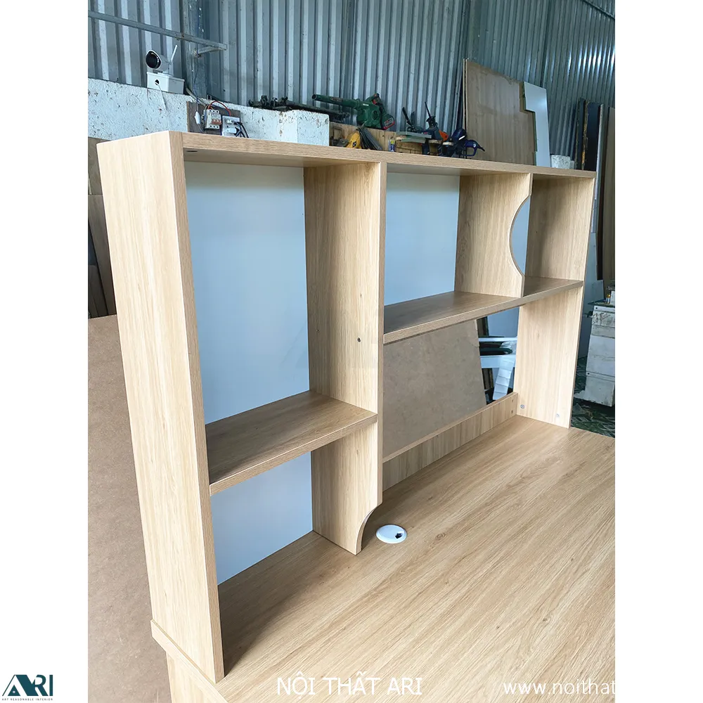 • Kệ sách tích hợp: Hệ giá sách phía trên được chia ngăn khoa học với các độ cao khác nhau, giúp bạn lưu trữ sách vở, đồ trang trí hoặc hồ sơ trong tầm tay.