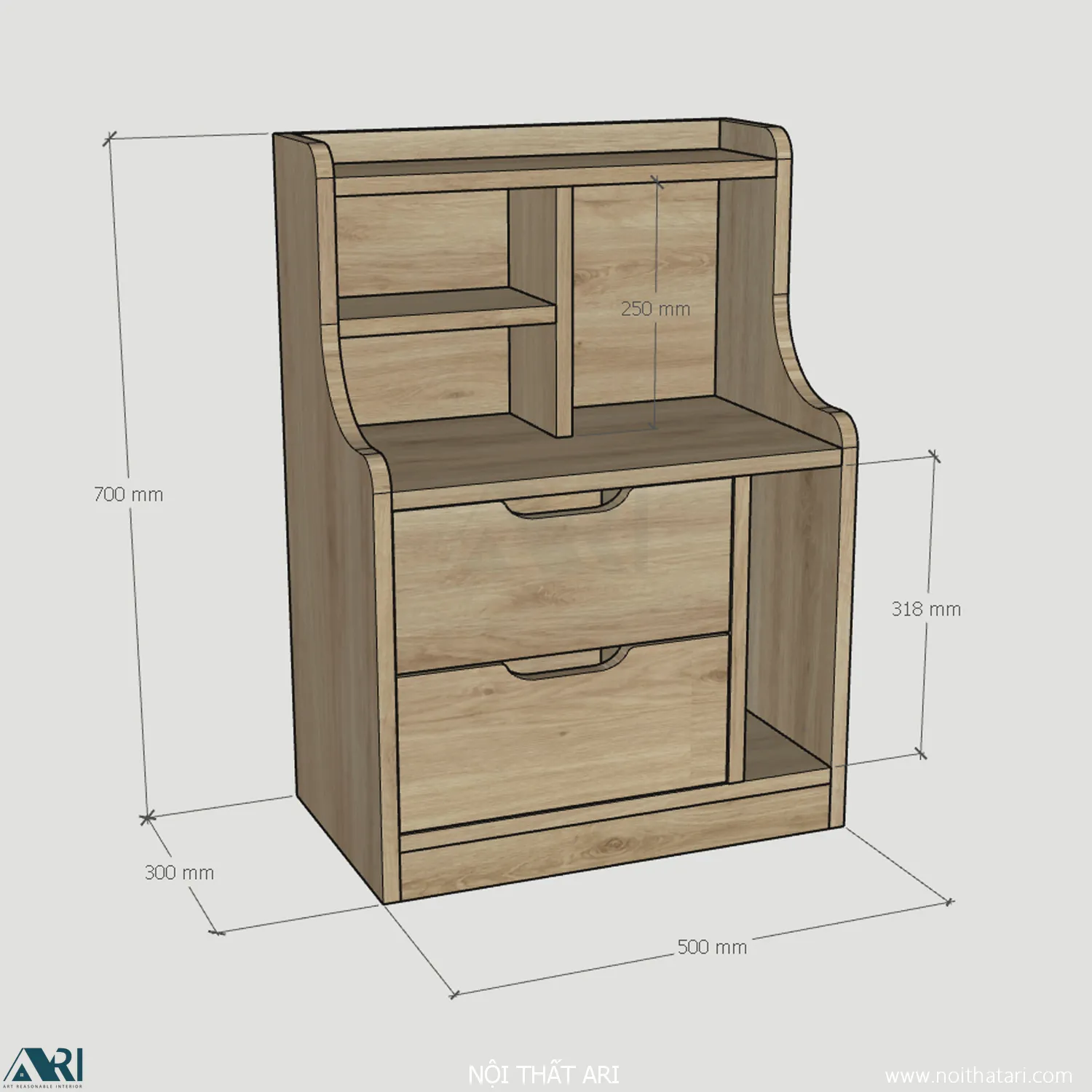 Thiết kế: 2 ngăn kéo, 1 hốc chứa đồ đứng, hệ kệ phân tầng phía trên.