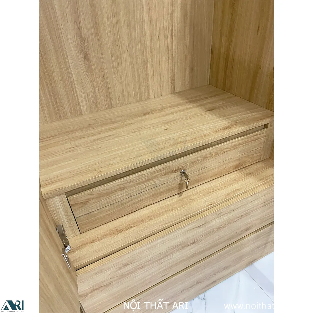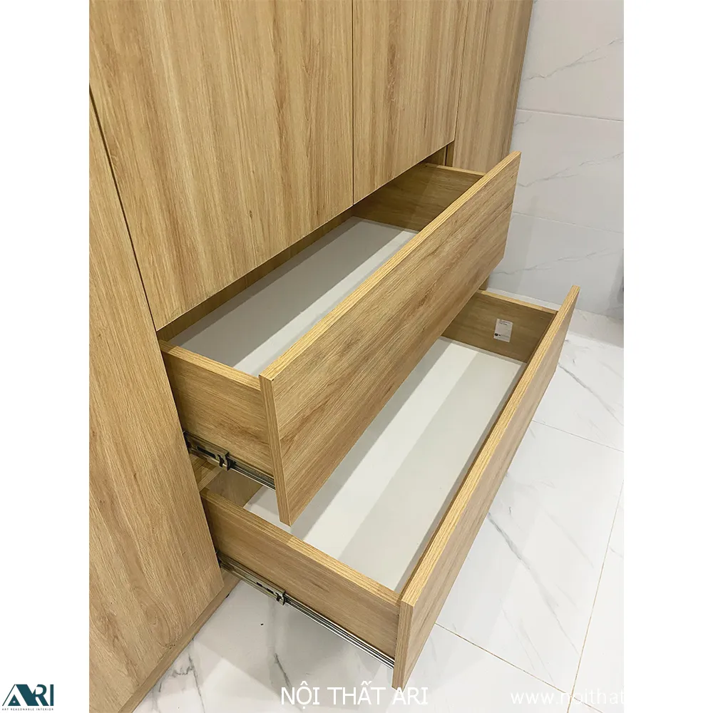 Kỹ thuật sản xuất: Ứng dụng công nghệ liên kết ốc cam và mộng gỗ, giúp bề mặt tủ láng mịn, thẩm mỹ, không để lại vết đinh vít lộ liễu.