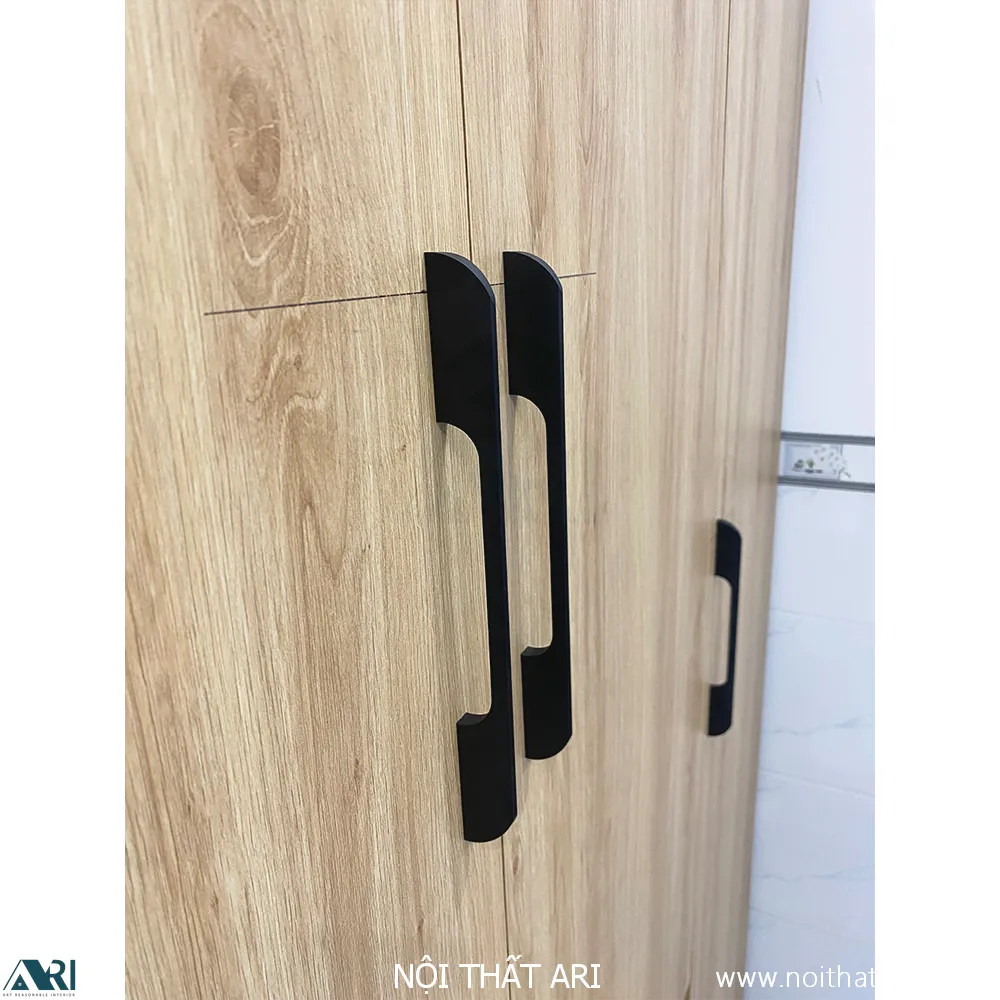 Tay nắm: Thiết kế tay nắm dạng thanh dài, màu đen nổi bật trên nền gỗ sáng, mang lại vẻ ngoài khỏe khoắn, hiện đại.