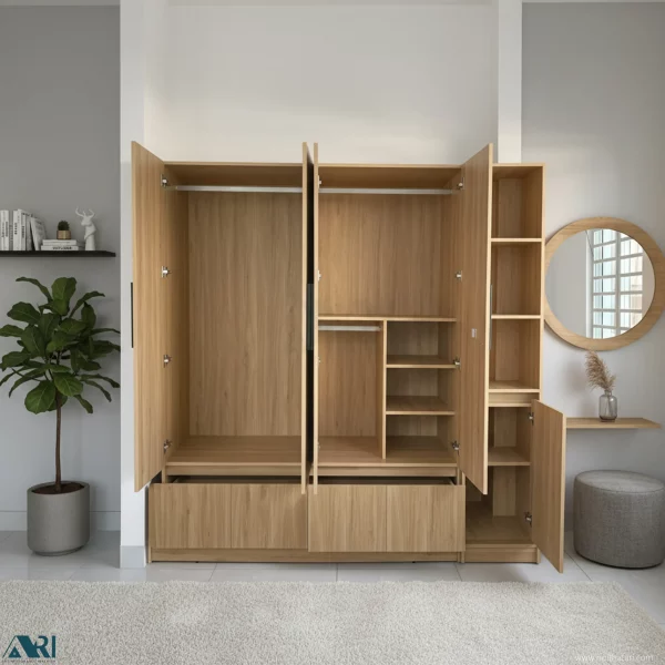 - Khoang lưu trữ đa năng: Khoang giữa được thiết kế linh hoạt với các ngăn kệ và hộc tủ. Các kệ gỗ có thể dùng để gấp quần áo, khăn tắm hoặc đặt các vật dụng trang trí. Phía dưới là các hộc tủ nhỏ, rất tiện lợi để cất giữ đồ lót, phụ kiện hoặc các vật dụng cá nhân quan trọng.