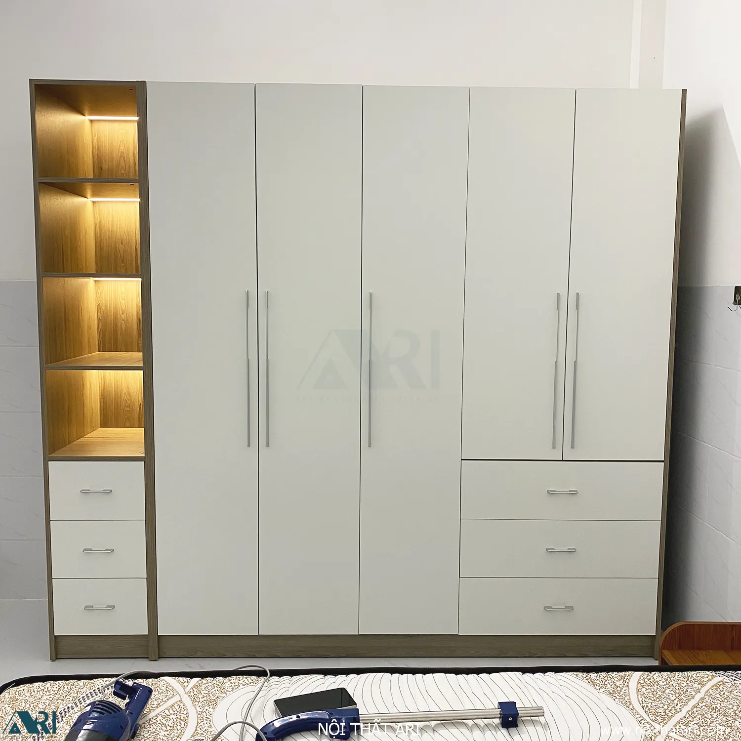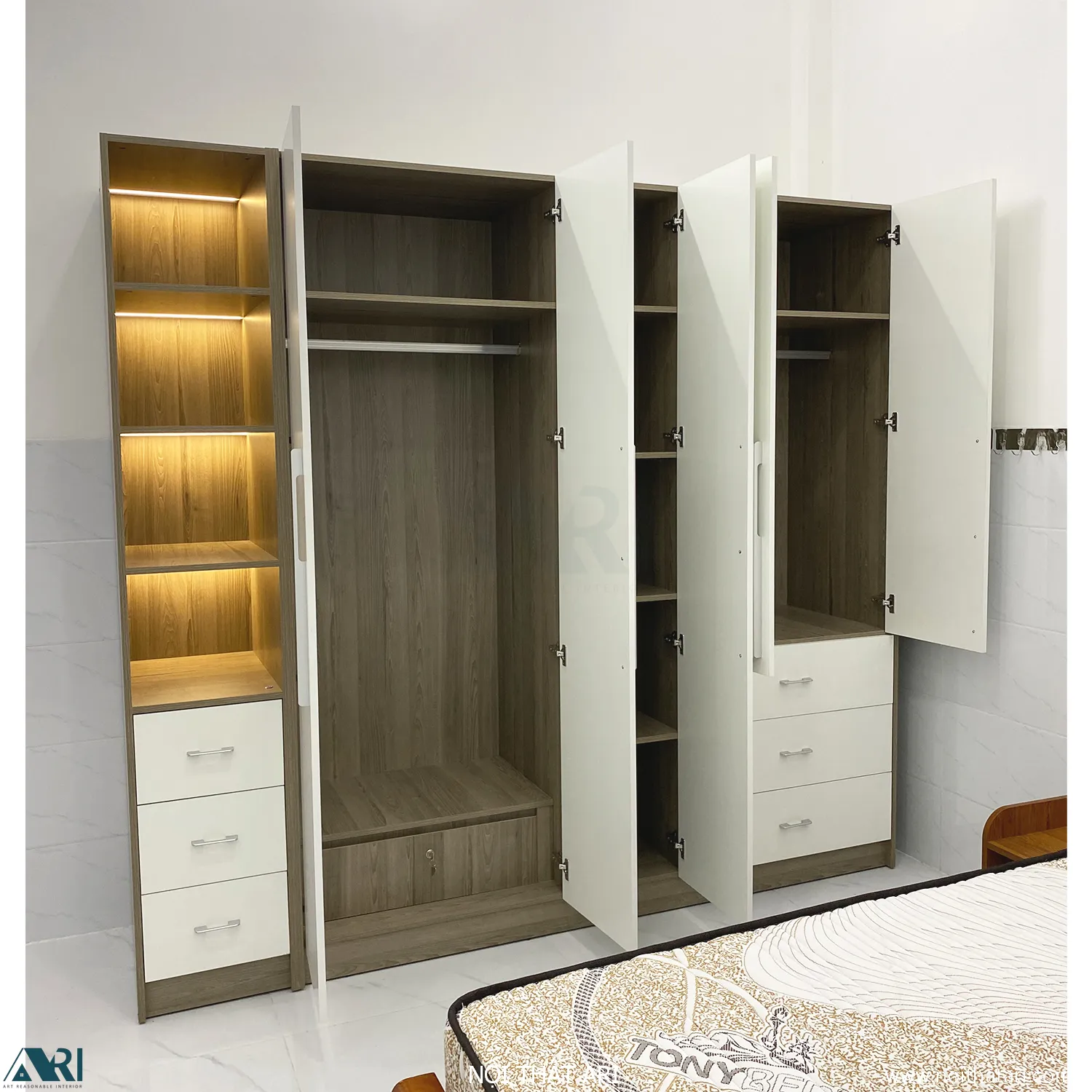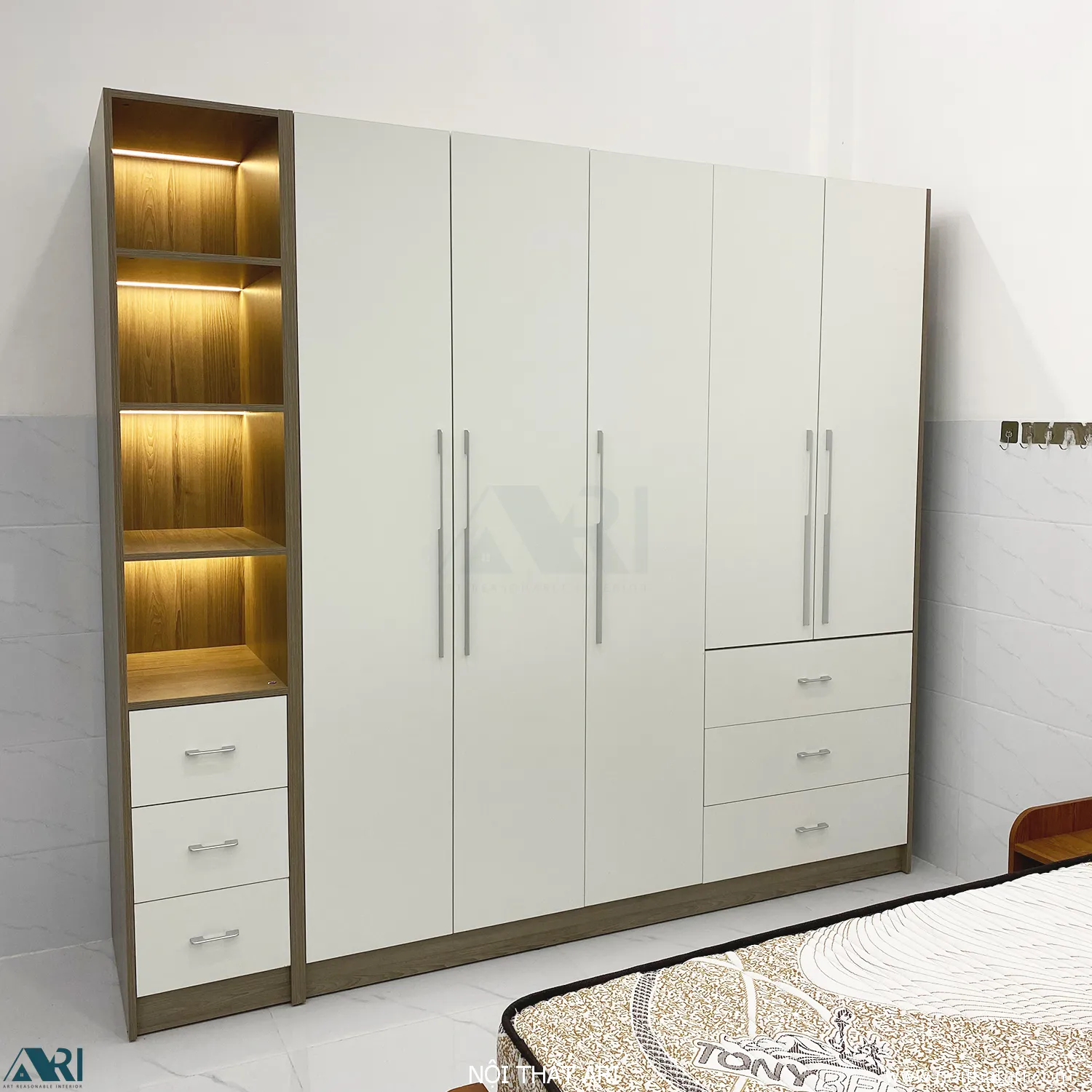 • Hệ kệ trang trí đèn LED: Phía bên trái là dãy kệ mở 4 tầng tích hợp đèn LED âm tủ hiện đại. Đây là nơi lý tưởng để trưng bày túi xách, nước hoa hoặc đồ decor, tạo điểm nhấn lung linh cho căn phòng vào ban đêm.