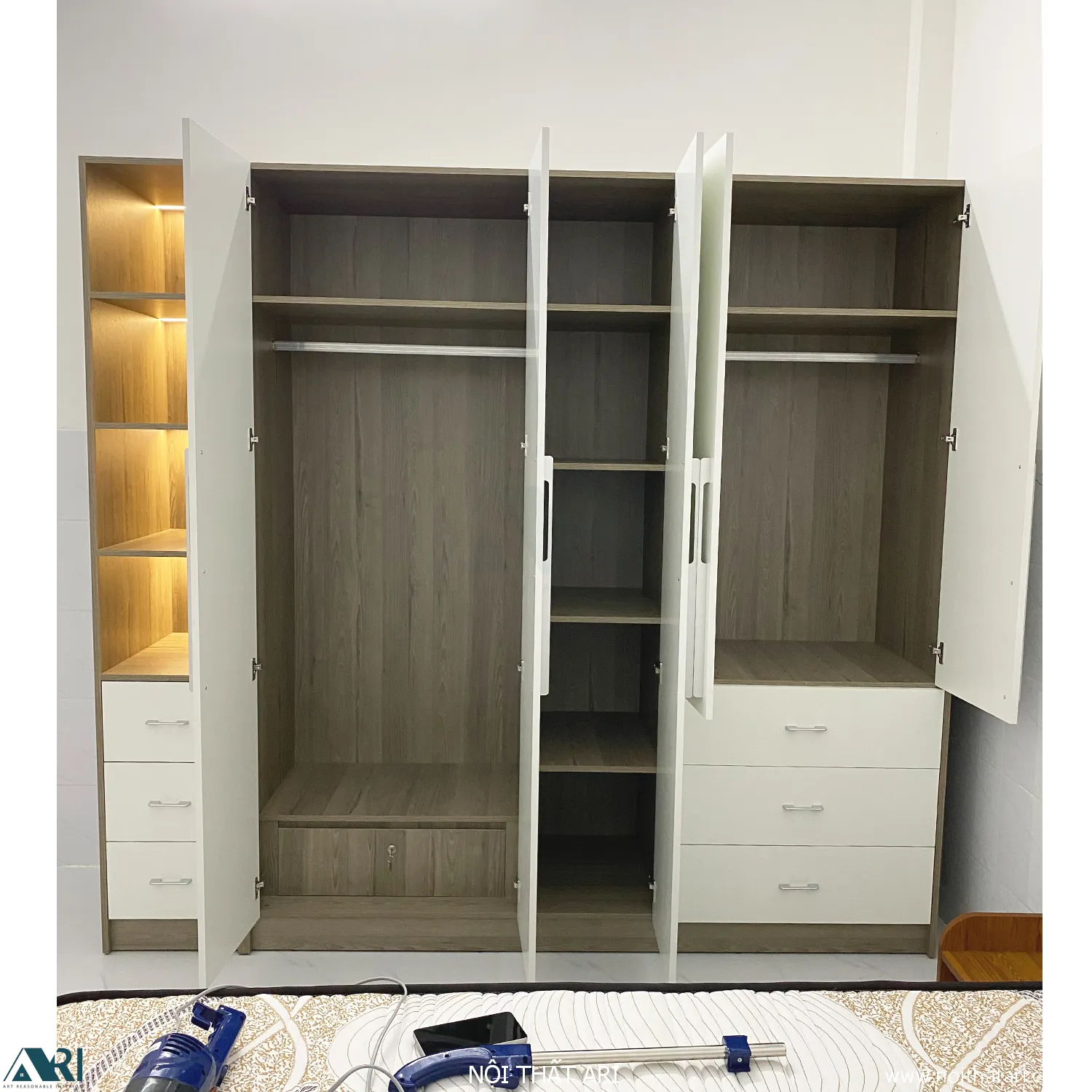 • Ngăn tầng linh hoạt: Các ngăn kệ được bố trí hợp lý để đựng chăn màn mùa đông hoặc quần áo gấp gọn.