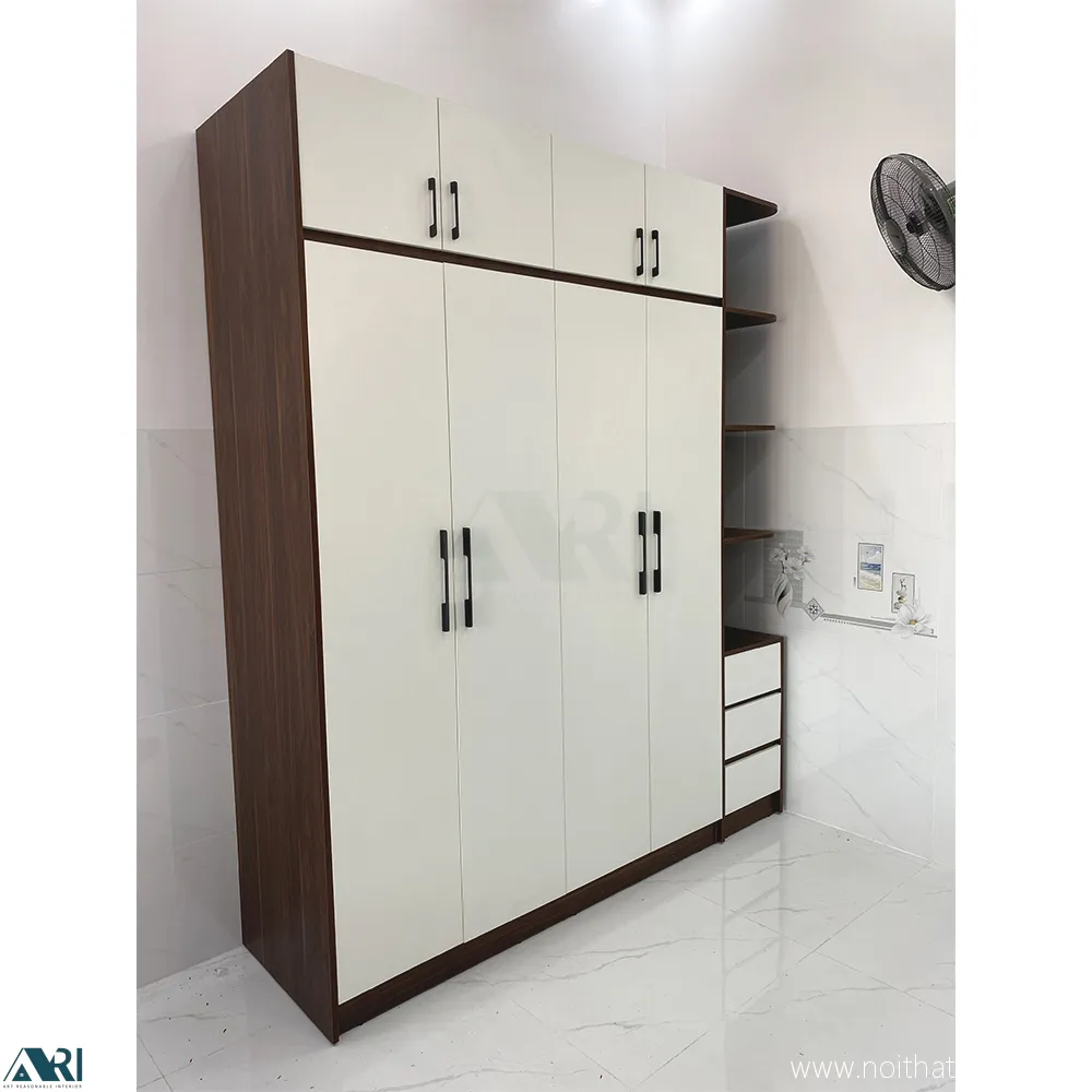 Mẫu tủ quần áo này được chế tác từ gỗ công nghiệp MDF cao cấp, một loại vật liệu được ưa chuộng trong thiết kế nội thất nhờ độ bền và tính thẩm mỹ vượt trội. Điểm nổi bật là khả năng kháng ẩm hiệu quả, giúp tủ không bị cong vênh hay mối mọt, ngay cả trong điều kiện thời tiết ẩm ướt tại Việt Nam. Tủ có sự kết hợp giữa tông màu gỗ tự nhiên và màu trắng, tạo nên vẻ ngoài hiện đại và sang trọng.